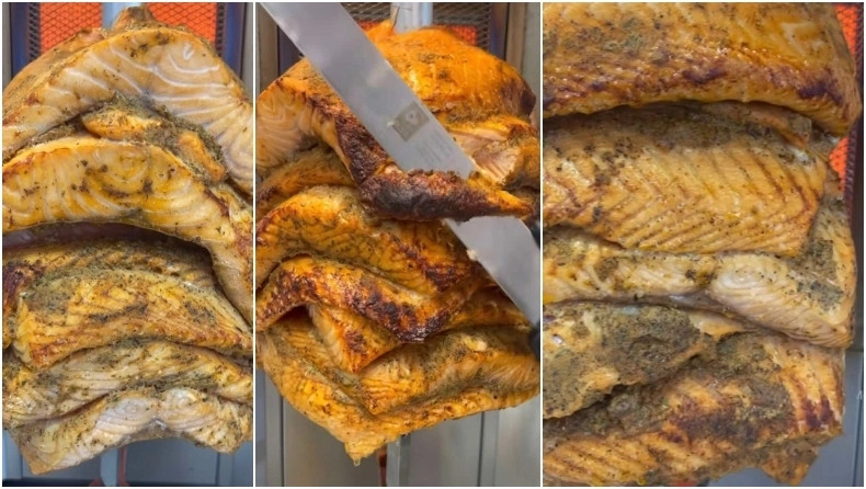 Το εν λόγω μαγαζί δημοσίευσε ένα βίντεο, στο οποίο φαίνεται να ψήνει τον σολομό όπως κάνουν τα σουβλατζίδικα με τον γύρο και μάλιστα στη συνέχεια να τον κόβει σε κομμάτια!