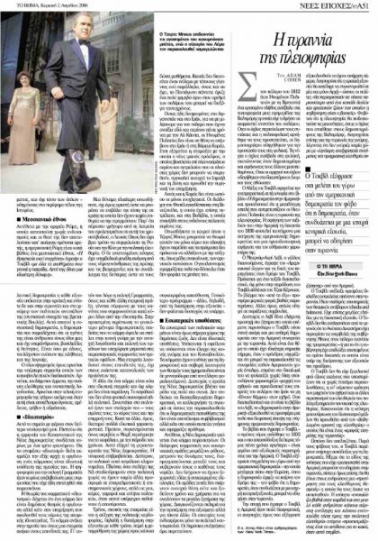 *Κείμενο του αμερικανού δημοσιογράφου και συγγραφέα Άνταμ Κόεν (Adam Cohen), που έφερε τον τίτλο «Η τυραννία της πλειοψηφίας» και είχε (ανα)δημοσιευτεί στην εφημερίδα «Το Βήμα» την Κυριακή 2 Απριλίου 2006. Την εποχή εκείνη ο Κόεν ήταν αρθρογράφος των New York Times, ο δε ρεπουμπλικάνος Τζορτζ Μπους ο νεότερος, Πρόεδρος των ΗΠΑ.
