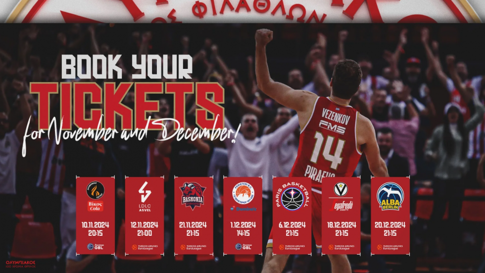 «Για την καλύτερη εξυπηρέτηση και προγραμματισμό των φιλάθλων, η Κ.Α.Ε. ΟΛΥΜΠΙΑΚΟΣ ανακοινώνει ότι την Τετάρτη 06/11/2024 και ώρα 12:00 θα ξεκινήσει η διάθεση εισιτηρίων για τους αγώνες των μηνών Νοεμβρίου – Δεκεμβρίου.