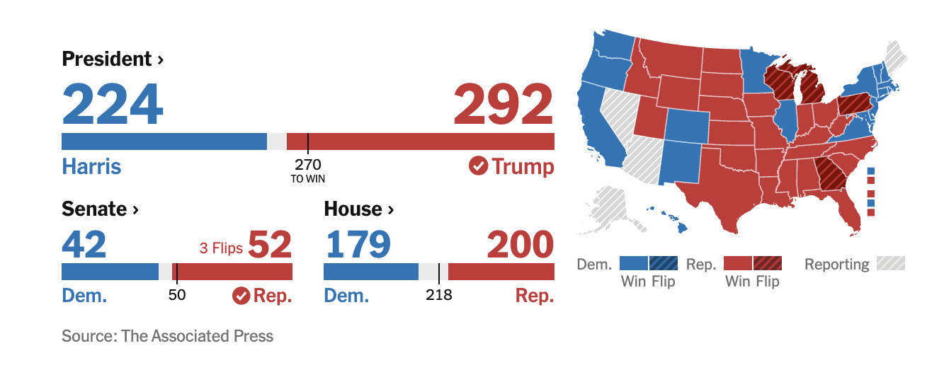 Ο Τραμπ μετά την νίκη του και στο Ουισκόνσιν συγκέντρωσε 277 εκλέκτορες ενώ απαιτούνται τουλάχιστον 270. Πλέον βρίσκεται στους 295 εκλέκτορες, έναντι 226 της Κάμαλα Χάρις ενώ απομένουν η Αριζόνα και η Νεβάδα.