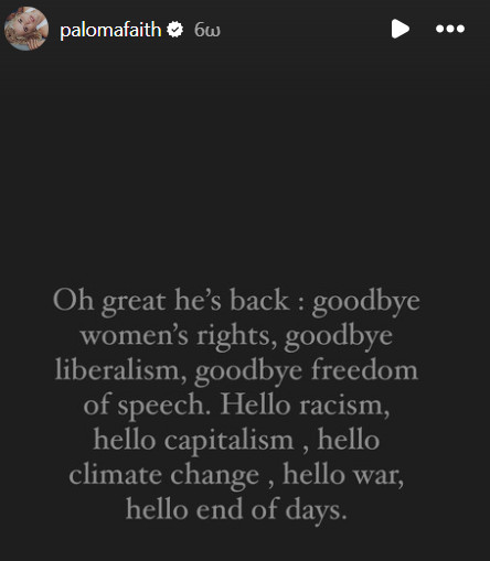 Μετά το άκουσμα της είδησης, η Παλόμα Φέιθ δήλωσε ότι η χώρα θα αποχαιρετήσει «τα δικαιώματα των γυναικών, τον φιλελευθερισμό και την ελευθερία του λόγου», προσθέτοντας: «Ρατσισμός, καπιταλισμός, κλιματική αλλαγή, πόλεμος, τέλος των ημερών».