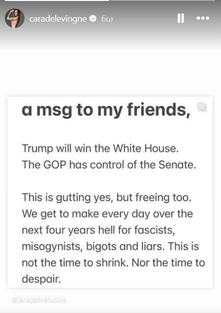Η Κάρα Ντελεβίν, που έχει σπίτι στο Λος Άντζελες, έστειλε ένα «μήνυμα στους φίλους της» -υιοθετώντας τα λόγια τ@ Janaya Future Khan- να μην απελπιστούν, αλλά να επικεντρωθούν στην καταπολέμηση των Ρεπουμπλικάνων, τους οποίους η δημοσίευση περιέγραφε ως «φασίστες, μισογύνηδες, φανατικούς και ψεύτες».