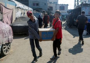 Νεαρός Παλαιστίνιος κουβαλά κουτί με βοήθεια που φέρει τα διακριτικά της UNRWA.