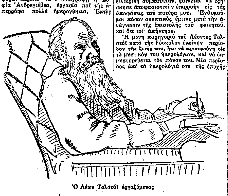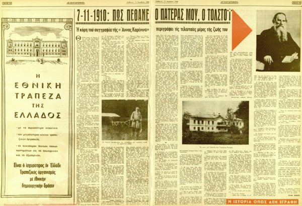 Στο τεύχος του «Ταχυδρόμου» που είχε κυκλοφορήσει στις 12 Νοεμβρίου 1960 υπήρχε ένα δισέλιδο δημοσίευμα αφιερωμένο στις τελευταίες ημέρες της ζωής του Λέοντος Τολστόι. Το σχετικό κείμενο, που έφερε την υπογραφή του λογοτέχνη και μεταφραστή Γιάννη Μπεράτη (1904-1968), ήταν βασισμένο στην ακριβή και καθ’ όλα αξιόπιστη περιγραφή των ημερών εκείνων από την κόρη του Τολστόι Αλεξάνδρα — εξ ου και ο τίτλος «7-11-1910: Πώς πέθανε ο πατέρας μου, ο Τολστόι».