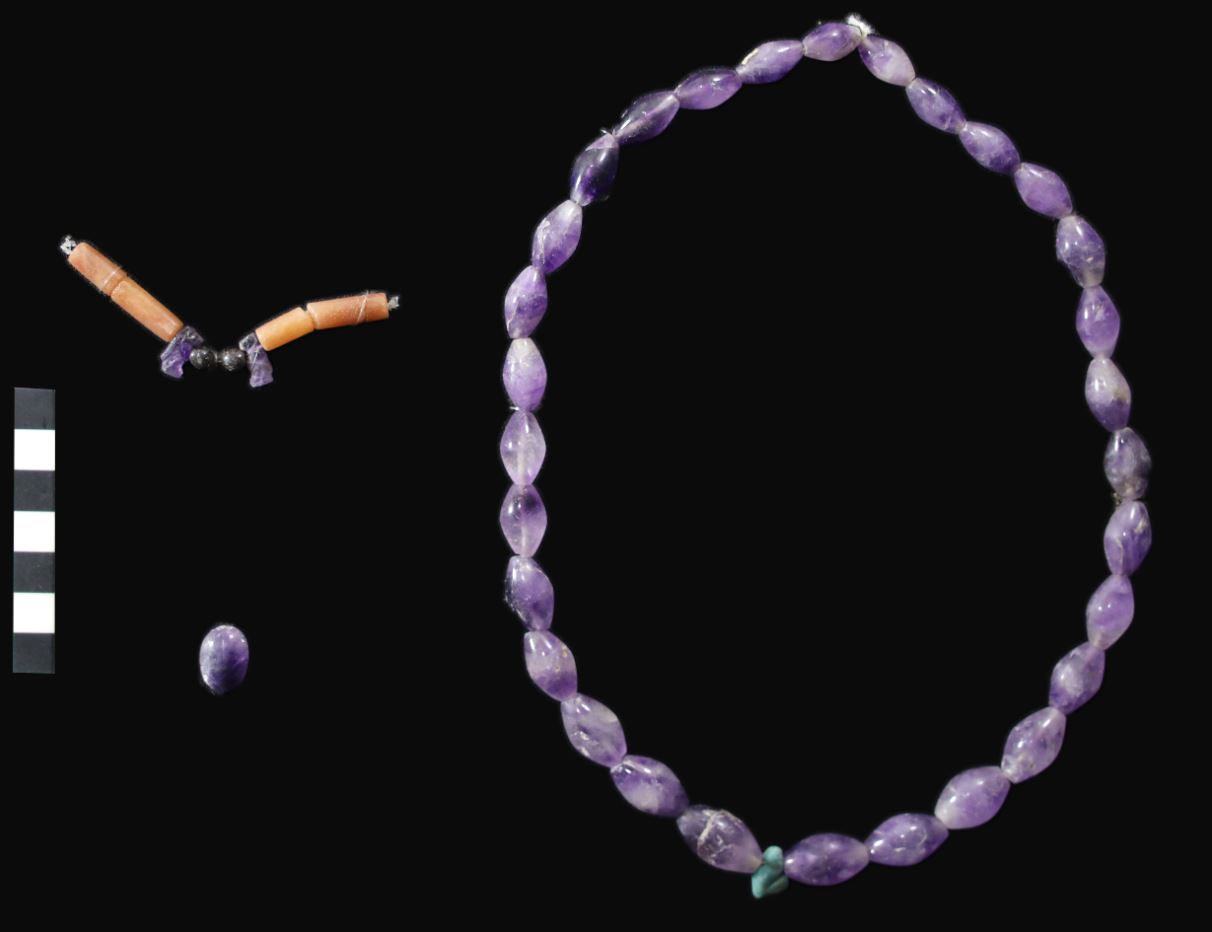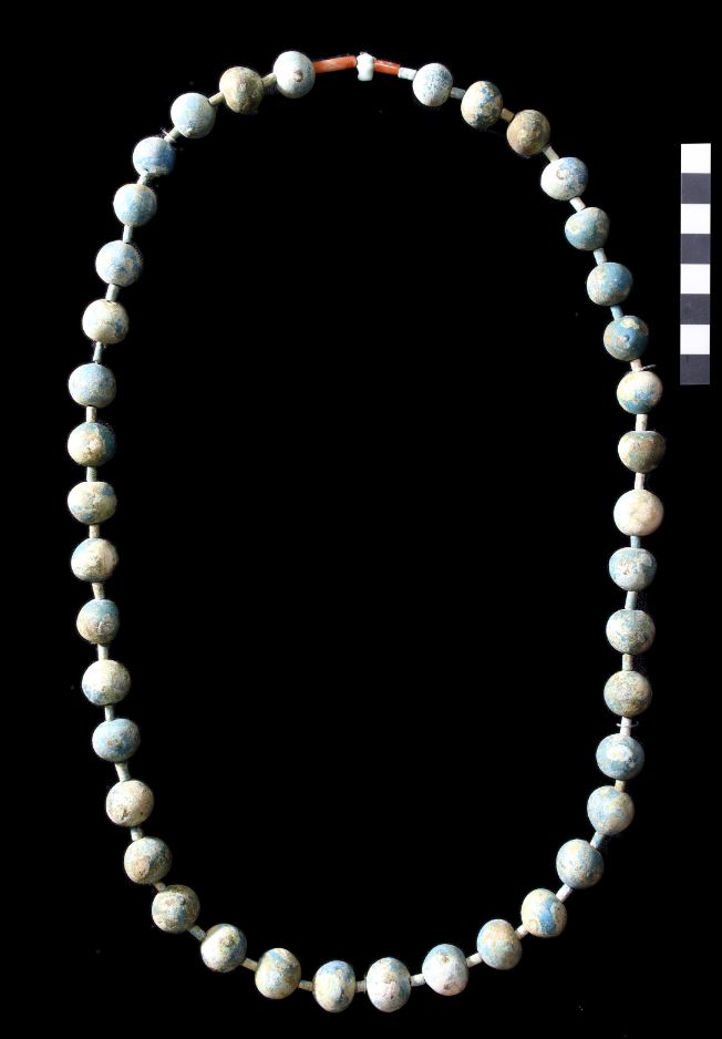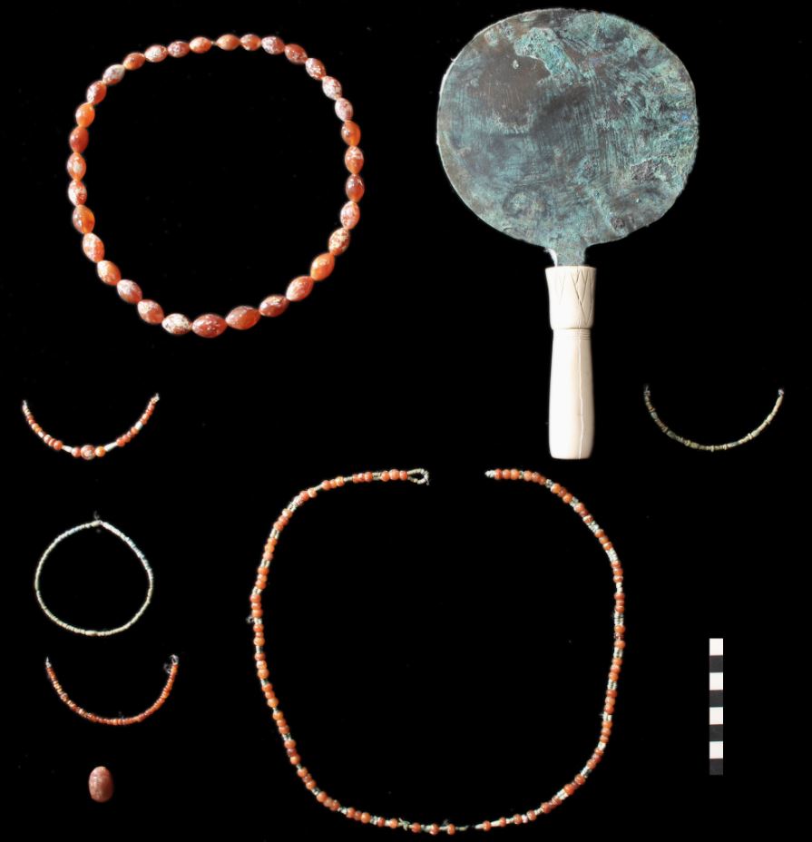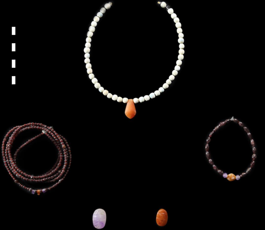 «Μεταξύ των ευρημάτων περιλαμβάνονται όμορφα περιδέραια, βραχιόλια, βραχιόλια, δαχτυλίδια σκαραβαίου και ζώνες από αμέθυστο, μπλε-πράσινη φαγεντιανή και άστριο», αναφέρεται στην ανακοίνωση.