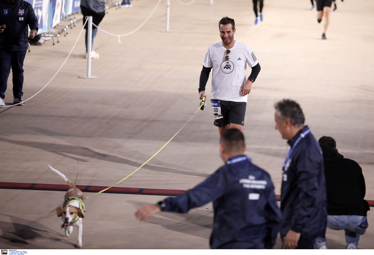 Δρομέας μαζί με το σκυλάκι του ολοκληρώνει τον αγώνα.