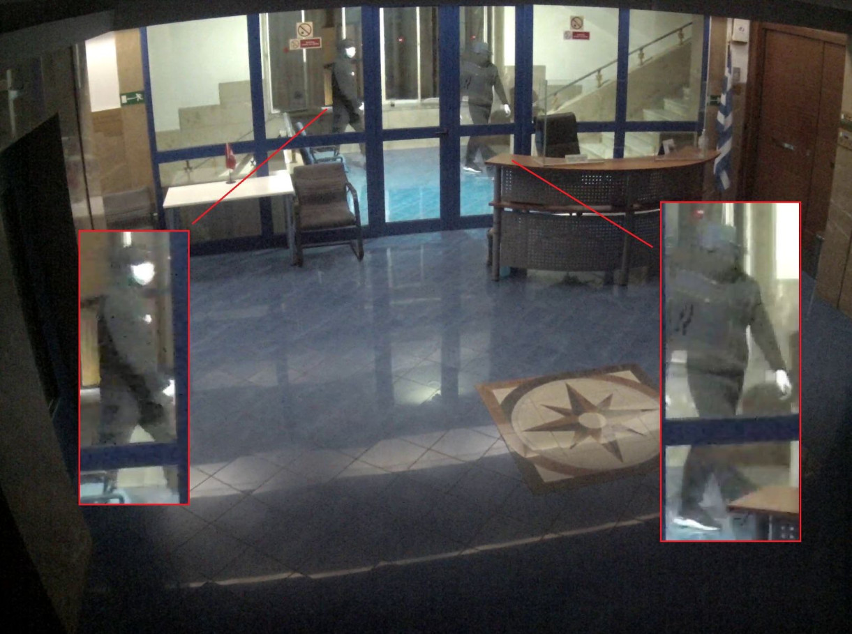 Συγκεκριμένα οι δράστες φαίνονται αρχικά να ανεβαίνουν από τον 5ο όροφο περνώντας τον 6ο όροφο όπου υπάρχει η κάμερα φορώντας αθλητικά παπούτσια, γάντια, καπέλα και μάσκες (χειρουργική και half-face) έχοντας καλυμμένα τα χαρακτηριστικά των προσώπων τους.