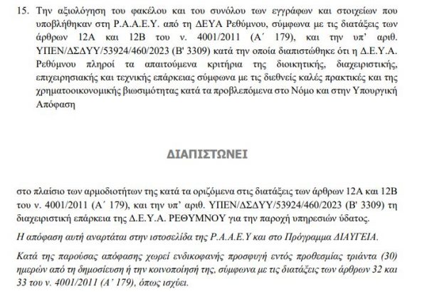 Σύμφωνα με την απόφαση που εκδόθηκε, κατόπιν ελέγχου του σχετικού φακέλου που υποβλήθηκε στην Ρ.Α.Α.Ε.Υ. διαπιστώθηκε, ότι η Δ.Ε.Υ.Α.Ρ. πληροί τα απαιτούμενα κριτήρια της διοικητικής διαχειριστικής, επιχειρησιακής και τεχνικής επάρκειας σύμφωνα με τις διεθνείς καλές πρακτικές και της χρηματοοικονομικής βιωσιμότητας κατά τα προβλεπόμενα στην σχετική νομοθεσία και την αντίστοιχη υπουργική απόφαση.
