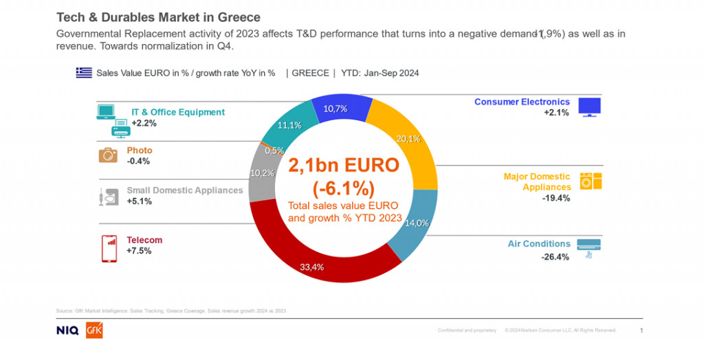 Παρά ταύτα όμως, συνολικά ο κλάδος των ειδών τεχνολογίας και των ηλεκτρικών συσκευών (Tech & Durables), ενώ παραμένει μια αγορά της τάξης των 2,1 δις ευρώ, και βρίσκεται στα υψηλότερα επίπεδα των τελευταίων 3 ετών, κινείται αρνητικά τόσο σε αξία, στο -6,1%, όσο και σε τεμαχιακές πωλήσεις (-1,9%).