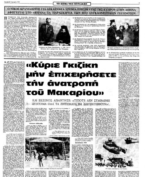 Το πρώτο μέρος της εκτενούς αφήγησης του Νίκου Κρανιδιώτη είχε δημοσιευτεί στο φύλλο του «Βήματος» που είχε κυκλοφορήσει την Κυριακή 28 Ιανουαρίου 1979. Σε αυτό περιλαμβάνονται, μεταξύ άλλων, τα συμβάντα και οι παρασκηνιακές εξελίξεις στην Αθήνα τις παραμονές του πραξικοπήματος του ’74, η δραματική συνομιλία που είχε ο Κρανιδιώτης με το στρατηγό Φαίδωνα Γκιζίκη, τότε Πρόεδρο της Δημοκρατίας, όπως και η ύστατη προειδοποίηση που είχε απευθύνει στον κύπριο διπλωμάτη ο Ευάγγελος Αβέρωφ – Τοσίτσας τις κρίσιμες εκείνες ημέρες.