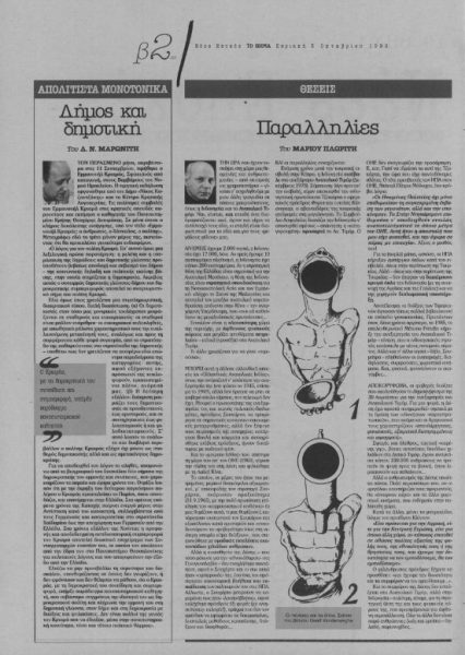 *Επιφυλλίδα του διαπρεπούς φιλολόγου, μεταφραστή, κριτικού και διανοουμένου Δ. Ν. Μαρωνίτη, που έφερε τον τίτλο «Δήμος και δημοτική» και είχε δημοσιευτεί στην εφημερίδα «Το Βήμα» την Κυριακή 3 Οκτωβρίου 1999.