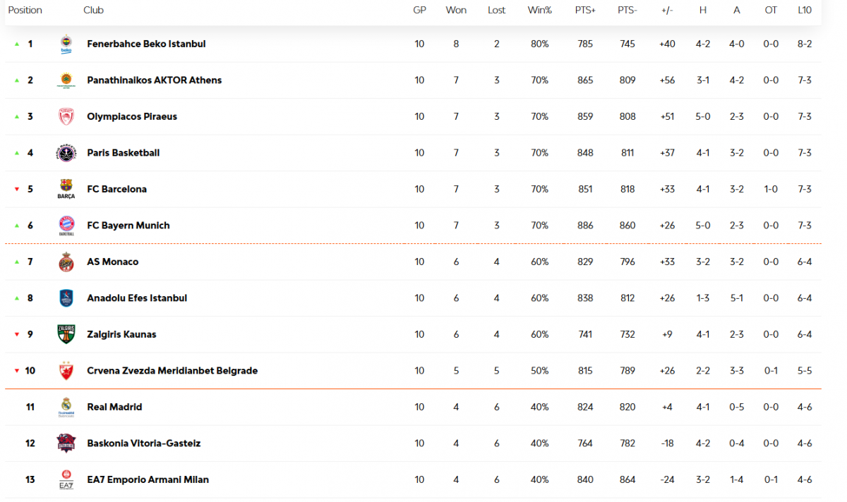 Οι πρωταθλητές Ευρώπης και οι Πειραιώτες έχουν σε 10 παιχνίδια ρεκόρ 7-3 και είναι στην δεύτερη και στην τρίτη αντίστοιχα, με τη μοναδική ομάδα που είναι από πάνω τους να είναι η Φενέρμπαχτσε του Σαρούνας Γιασικεβίτσιους με ρεκόρ 8-2.