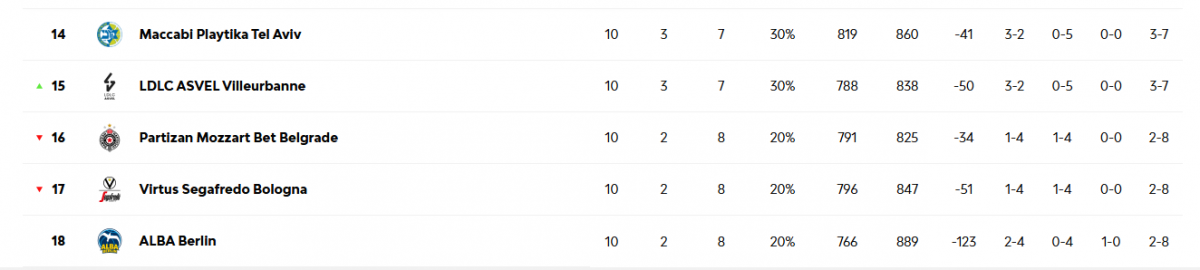 Από την άλλη, κανονικά είναι μέσα η Μπαρτσελόνα με ρεκόρ 7-3, ενώ το εντυπωσιακό και η μεγάλη έκπληξη της σεζόν μέχρι στιγμής είναι χωρίς καμία αμφιβολία η Παρί, η οποία κατέκτησε πέρσι το EuroCup και μπήκε ως πρωτάρα στη Euroleague και έχει κι αυτή ρεκόρ 7-3. Την εξάδα συμπληρώνει η Μπάγερν, με τους Βαυαρούς να έχουν κι αυτοί ρεκόρ 7-3, σε μία αδιανόητη σεζόν, όπου 5 ομάδες σε 10 ματς έχουν 7-3 και η Φενέρ είναι στην κορυφή με 8-2.
