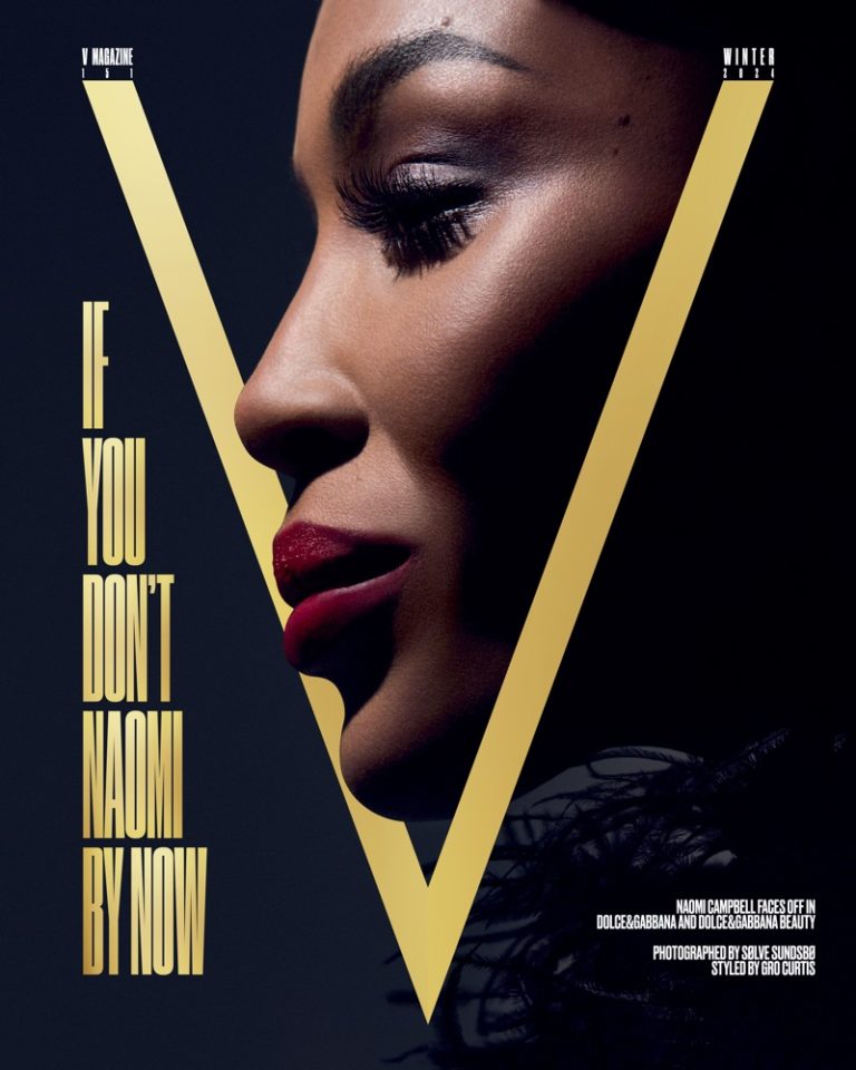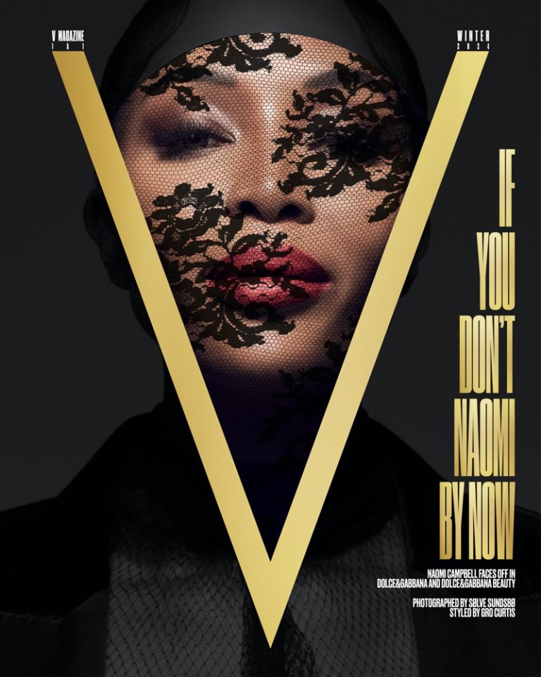 Ως πρωταγωνίστρια για τέσσερις φορές σε εξώφυλλο για το V Magazine, η Ναόμι Κάμπελ «συνεχίζει να αιχμαλωτίζει, φέρνοντας ένα εμβληματικό μείγμα πολυπλοκότητας και έντασης στο όραμα των Dolce & Gabbana για σκοτεινό ρομαντισμό για τη σεζόν» σχολιάζει το περιοδικό.