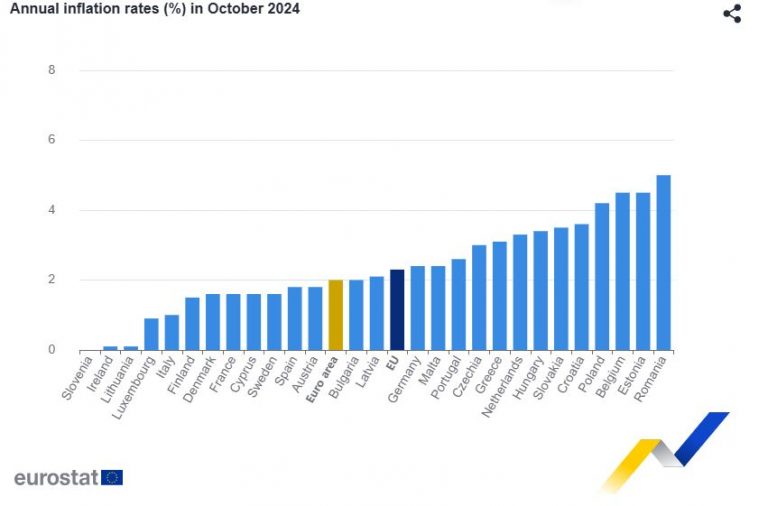 Ο ετήσιος πληθωρισμός στην Ευρωπαϊκή Ένωση ήταν 2,3% τον Οκτώβριο του 2024, από 2,1% τον Σεπτέμβριο. Ένα χρόνο νωρίτερα, το ποσοστό ήταν 3,6%.