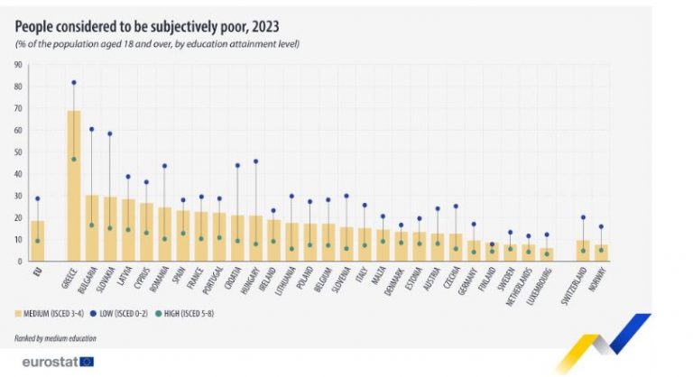 Συνολικά, 26 χώρες της ΕΕ ανέφεραν υψηλότερα ποσοστά μεταξύ των ατόμων με χαμηλό μορφωτικό επίπεδο που θεωρούνταν υποκειμενικά φτωχοί, σε σύγκριση με τα άτομα με μεσαίο και υψηλό μορφωτικό επίπεδο.