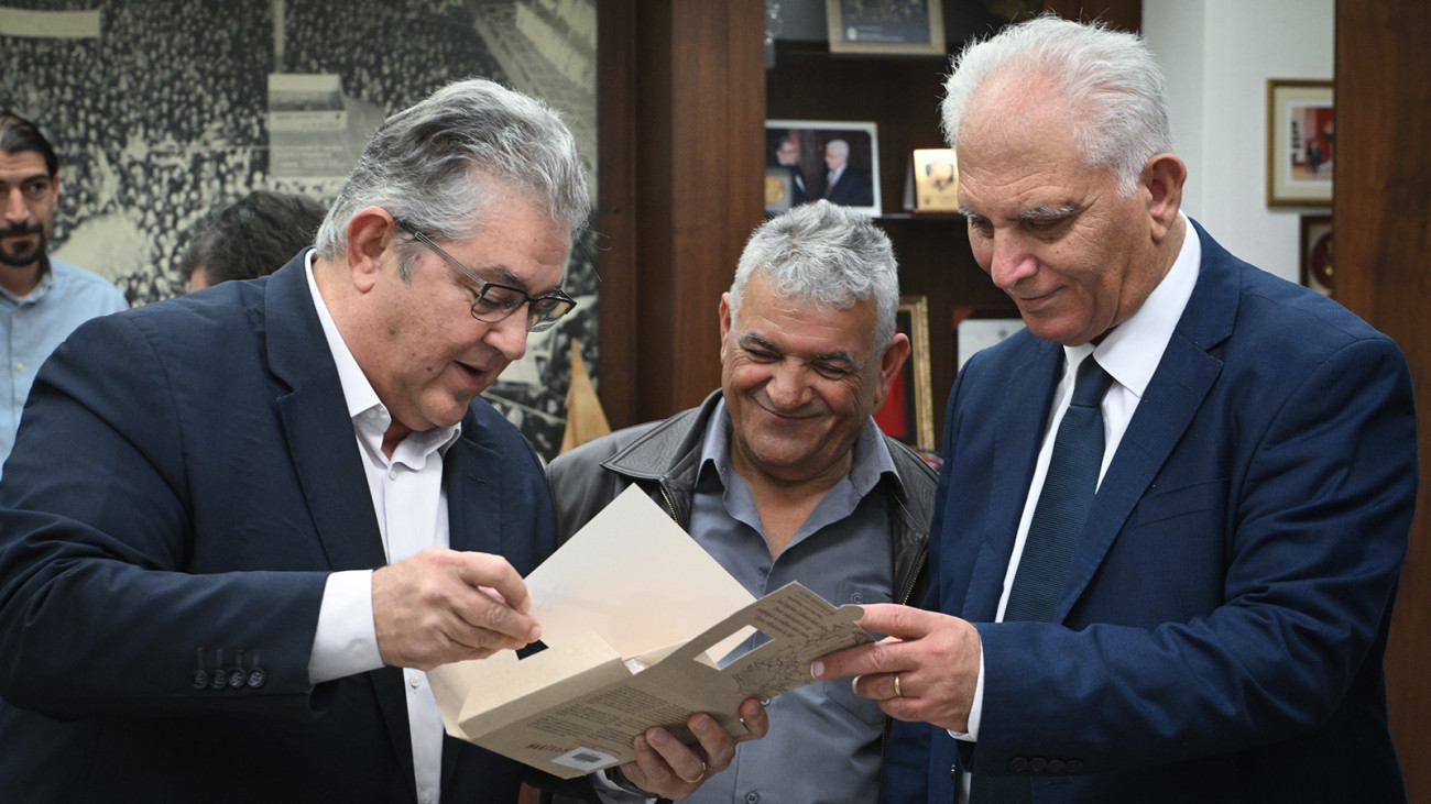 Ο γενικός γραμματέας της Κεντρικής Επιτροπής του ΚΚΕ, Δημήτρης Κουτσούμπας, συναντήθηκε στον Περισσό με αντιπροσωπεία του Κόμματος του Λαού της Παλαιστίνης, με επικεφαλής τον γενικό του γραμματέα, Μπασάμ Αλσάλιχι.