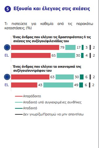 Στο μέσο όρο της ΕΕ τα ποσοστά είναι αντιστρόφως ανάλογα: Το 63% θεωρεί απαράδεκτο τον οικονομικό έλεγχο του άντρα στη γυναίκα, το 30% το αποδέχεται υπό συνθήκες και το 6% το θεωρεί αποδεκτό.