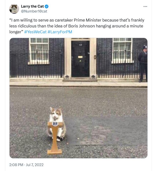 Ίσως ο Μπόρις Τζόνσον που παραιτούμενος είπε πως θα του λείψει «η γάτα του ο Λάρι», με τον γάτο να φρόντισε να υπενθυμίσει στο κοινό στα μέσα κοινωνικής δικτύωσης ότι δεν ποτέ ήταν «η γάτα του Μπόρις Τζόνσον». Ύστερα θέλησε να πάρει την θέση του μεταβατικού πρωθυπουργού, αλλά ο Τζόνσον αντικαταστάθηκε από την Λιζ Τρας.