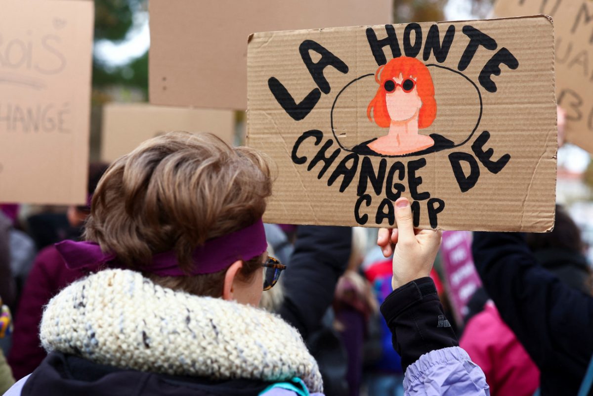 «Η ντροπή αλλάζει πλευρά», αναγράφεται στο πανό με σκίτσο της Ζιζέλ Πελικό, στις μεγάλες διαδηλώσεις κατά της έμφυλης βίας στη Γαλλία, στις 23 Νοεμβρίου (REUTERS/Manon Cruz)