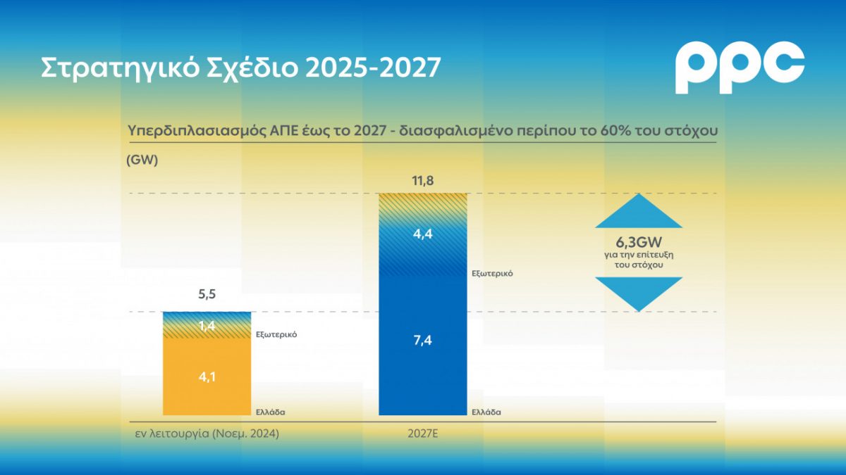 Ειδικότερα, επιδιώκει ανάπτυξη 6,3 GW ΑΠΕ από σήμερα μέχρι και το 2027 σε Ελλάδα και Νοτιοανατολική Ευρώπη με στόχο η εγκατεστημένη ισχύς από ΑΠΕ να ανέλθει σε 11,8 GW το 2027. Ήδη, σήμερα, περίπου το 60% των ΑΠΕ που θα προστεθούν είναι σε φάση κατασκευής ή έτοιμα προς κατασκευή ή και σε διαδικασία διαγωνισμού (υποβολή προσφορών). Θα προχωρήσει σε ανάπτυξη 1,8 GW ευέλικτης παραγωγής ενέργειας, όπως αντλησιοταμίευση, μπαταρίες, μονάδες αερίου, και υδροηλεκτρικά έργα τα οποία αντιμετωπίζουν την στοχαστικότητα των ΑΠΕ και παράγουν μεγαλύτερη αξία.