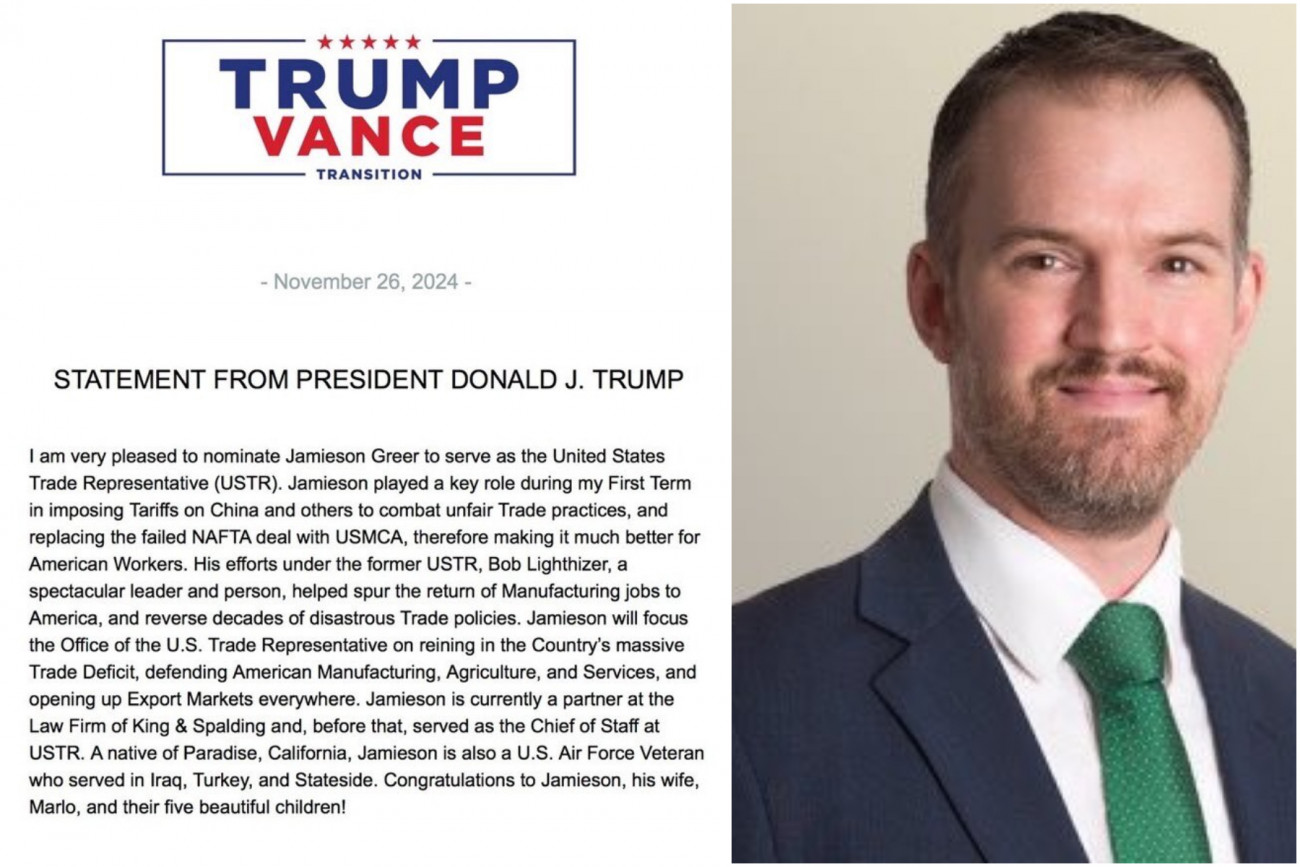 Ο Αμερικανός εκλεγμένος πρόεδρος Ντόναλντ Τραμπ ονόμασε χθες Τρίτη επόμενο αντιπρόσωπο των ΗΠΑ για το εμπόριο (USTR) δικηγόρο ειδικευμένο στο διεθνές εμπορικό δίκαιο, τον Τζέιμισον Γκριρ, που είχε ήδη διακριθεί στην άσκηση επιθετικής πολιτικής έναντι της Κίνας στην προηγούμενη θητεία του Ρεπουμπλικάνου.