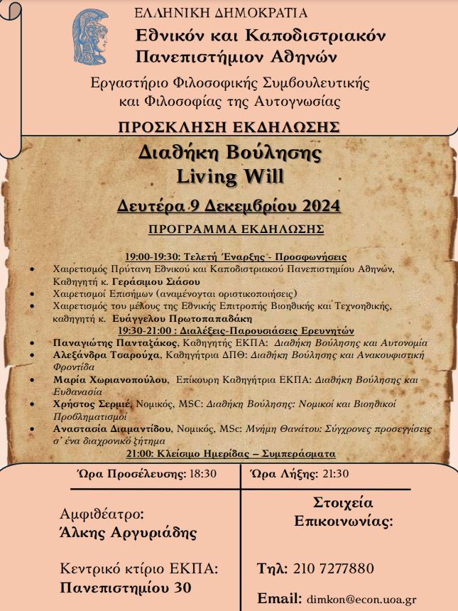 Το Εργαστήριο Φιλοσοφικής Συμβουλευτικής και Αυτογνωσίας του ΕΚΠΑ, στο πλαίσιο του ανοίγματος της ακαδημαϊκής κοινότητας προς την Ελληνική Κοινωνία, αποφάσισε την πραγματοποίηση τυχαιοποιημένης μελέτης σ’ ένα ευρύ δείγμα συμπολιτών μας, με θέμα την στάση των Ελλήνων απέναντι σ’ ένα θεσμό τη Διαθήκη Βούλησης (Living Will), ο οποίος έχει καθιερωθεί σε πολλές χώρες του Εξωτερικού.