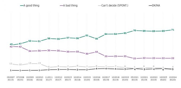 Πρόκειται για ιστορικό υψηλό με το ευρώ να αποκτά τη στήριξη της κοινής γνώμης ολοένα και περισσότερο από το 2007 μέχρι και σήμερα που «μετρά» το ευρωβαρόμετρο.