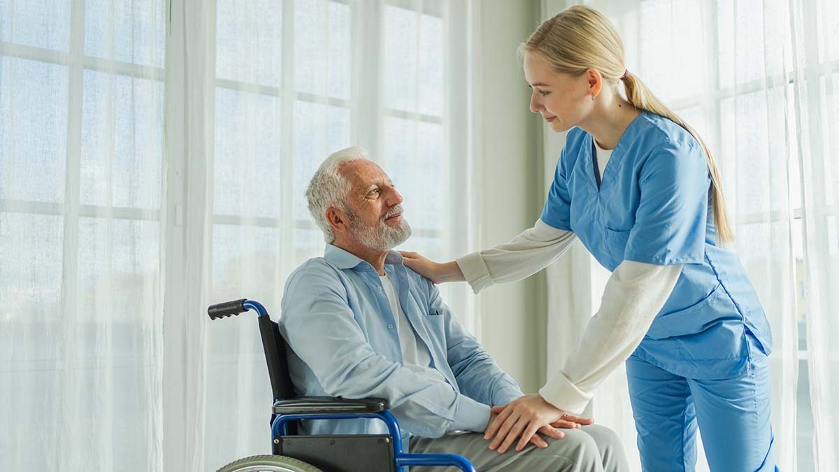 Help support retirement healthcare. Nurse helping old man in wheelchair. Patient and woman in nursing home for medical caregiver. Nurse taking care of paralyzed man in chair for people with disability
