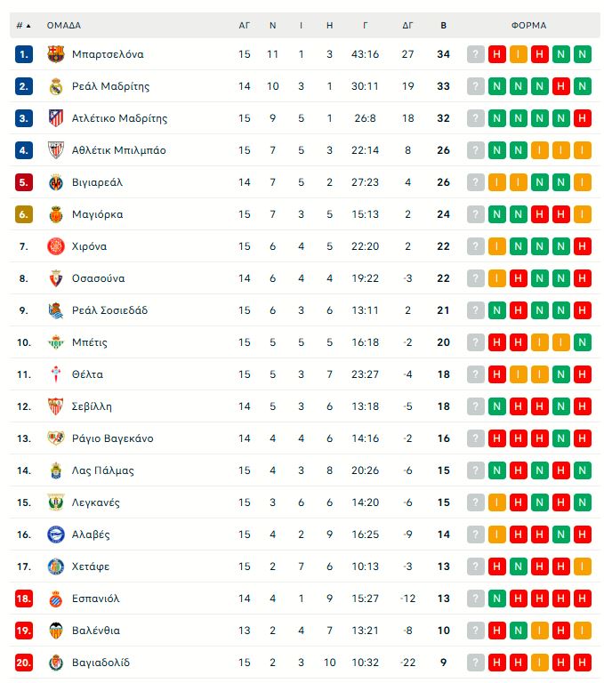 Η βαθμολογία της La Liga