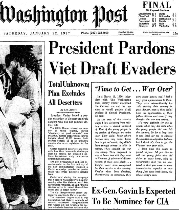 Την πρώτη πλήρη ημέρα της θητείας του, το 1977, ο πρόεδρος Κάρτερ ακολούθησε την προεκλογική του υπόσχεση να δώσει χάρη σε όσους απέφευγαν τη στράτευση στον πόλεμο του Βιετνάμ, σε μια προσπάθεια να αφήσει στο παρελθόν τον διχασμό που προκάλεσε ο πόλεμος στην αμερικανική κοινωνία.