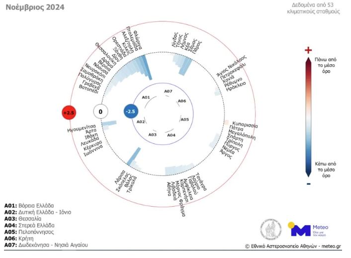 Είναι σημαντικό να σημειωθεί πως για την Κρήτη ο Νοέμβριος του 2024 είναι ο πρώτος μήνας που καταγράφηκε με θερμοκρασίες κάτω από την μέση τιμή της περιόδου 2010-2019, μετά από 16 συνεχόμενους μήνες με θετικές αποκλίσεις (από τον Ιούλιο 2023).