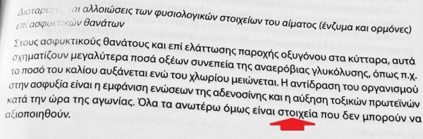 Κι αυτό έγινε με επίκληση αποσπάσματος βιβλίου του έγκριτου ιατροδικαστή Δημήτρη Ψαρούλη. Στο εν λόγω απόσπασμα του βιβλίου που παρουσιάσθηκε από ιατροδικαστές σημειώνεται ότι ένας θάνατος από ασφυξία μπορεί να προκαλέσει αύξηση του καλίου.