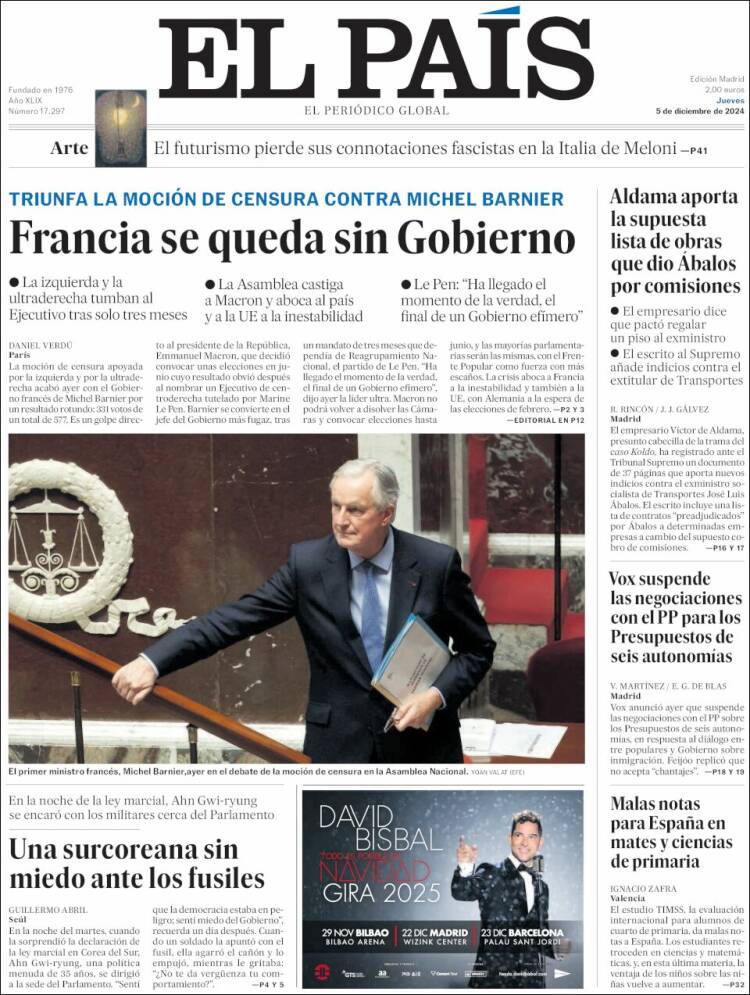 «Η τύφλωση του προέδρου είναι σε αυτό το στάδιο αδικαιολόγητη, λαμβανομένης υπόψη της θεσμικής κρίσης που προκάλεσαν οι αποφάσεις του. Είναι επίσης επικίνδυνη στο συστημικό επίπεδο για τη Γαλλία λόγω της δύσκολης, αν όχι αδύνατης, εξίσωσης του προϋπολογισμού, που θα πρέπει να αντιμετωπίσει η μελλοντική κυβέρνηση, όποιας μορφής κι αν είναι αυτή», επιμένει η El Pais στο κύριο άρθρο της, ενώ η La Vanguardia έχει τίτλο «Ο Μπαρνιέ πέφτει και η Γαλλία κάνει άλμα στο κενό».