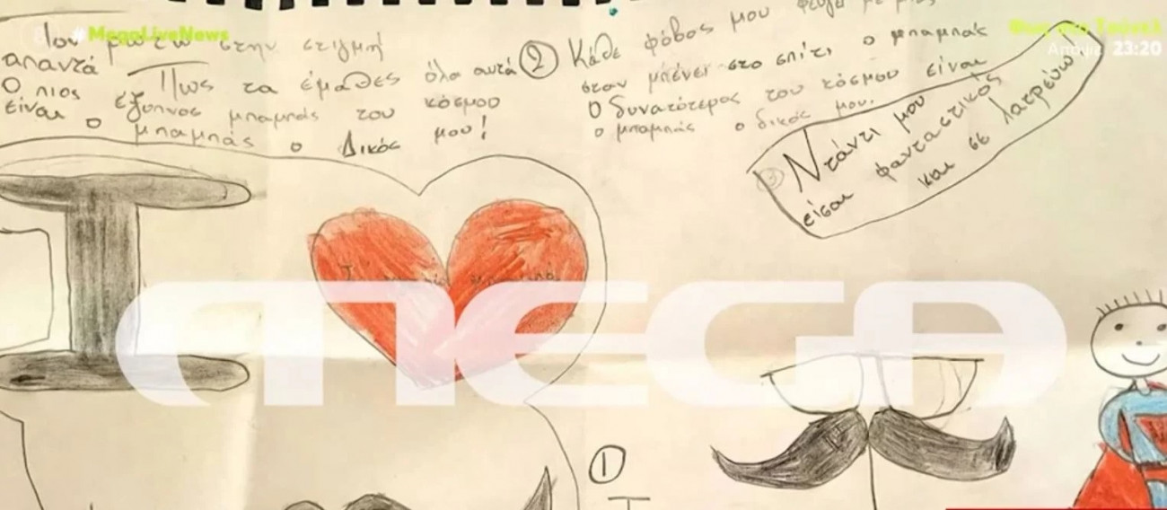 Στη δεύτερη ζωγραφιά βλέπουμε εκφράσεις όπως «ο πιο έξυπνος μπαμπάς του κόσμου», «κάθε φόβος μου φεύγει μόλις μπαίνει ο μπαμπάς στο σπίτι». Υπενθυμίζεται ότι τις ζωγραφιές τις έχει αναρτήσει ο ίδιος ο κατηγορούμενος, ενώ ο γραφικός χαρακτήρας δεν φαίνεται να είναι μικρού παιδιού, σύμφωνα με το Mega.
