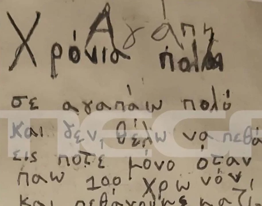 Το παιδί εύχεται μέσω της ζωγραφιάς χρόνια πολλά στον πατέρα, απεικονίζοντας τον να χτυπά με το γκλοπ τη μητέρα στο κεφάλι.