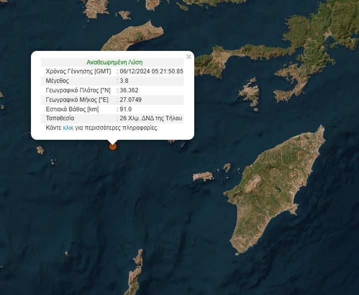 Νέα σεισμική δόνηση 3,8 Ρίχτερ, σημειώθηκε λίγο μετά τις 7 το πρωί στα ανοιχτά της Τήλου