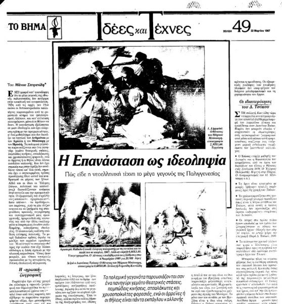 Στο φύλλο του «Βήματος» που είχε κυκλοφορήσει στις 22 Μαρτίου 1987 υπήρχε ένα πολύ ενδιαφέρον άρθρο του ιστορικού τέχνης Μάνου Στεφανίδη, τότε Επιμελητή της Εθνικής Πινακοθήκης, που έφερε τον τίτλο «Η Επανάσταση ως ιδεοληψία». Στο κείμενό του, που αφορούσε με δυο λόγια το πώς αντιμετώπισε η νεοελληνική τέχνη το μείζον γεγονός της εθνικής παλιγγενεσίας, ο Στεφανίδης, νυν ομότιμος καθηγητής του ΕΚΠΑ, έγραφε τα ακόλουθα για τον Βρυζάκη και τη Σχολή του Μονάχου: