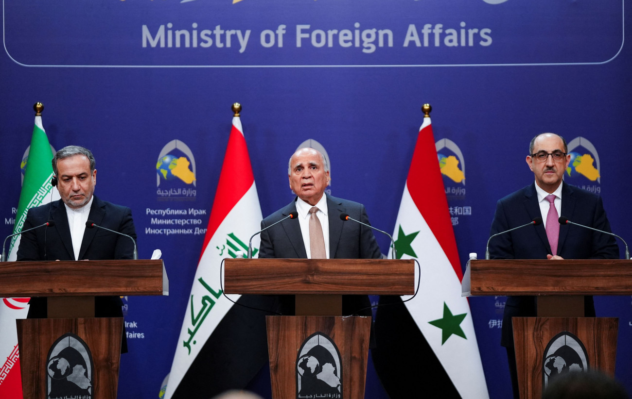 Η επίθεση που εξαπέλυσαν οι αντάρτες στη Συρία κατά του προέδρου Μπασάρ αλ-Άσαντ, η οποία χαρακτηρίζεται «τρομοκρατική» από το Ιράν, συνιστά απειλή για τη Μέση Ανατολή, δήλωσε σήμερα από τη Βαγδάτη ο επικεφαλής της ιρανικής διπλωματίας (απεικονίζεται με τους ομολόγους του από Ιράκ και Συρία.).