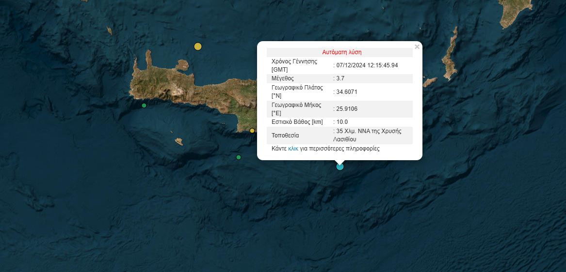 Συγκεκριμένα ο σεισμός σημειώθηκε 35χλμ νοτιοανατολικά της περιοχής Χρυσή Λασιθίου.