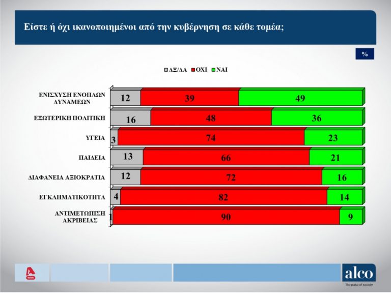 Σύμφωνα με το δεύτερο μέρος της δημοσκόπησης της ALCO για λογαριασμό του Alpha, το 90% των ερωτηθέντων δηλώνουν ότι δεν είναι ικανοποιημένοι από τις επιδόσεις της κυβέρνησης στην αντιμετώπιση της ακρίβειας. Το 82% δεν είναι ικανοποιημένο σε ό,τι αφορά την αντιμετώπιση της εγκληματικότητας.