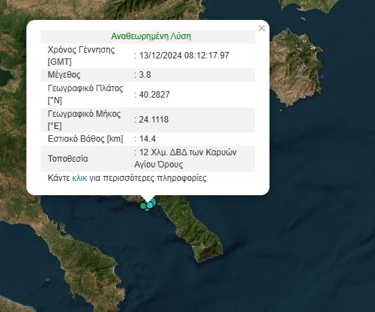 Σύμφωνα με τις πρώτες εκτιμήσεις το επίκεντρό του σεισμού εντοπίζεται 8 Χλμ. ΔΒΔ των Καρυών Αγίου Όρους με το εστιακό βάθος του στα 10 χλμ.
