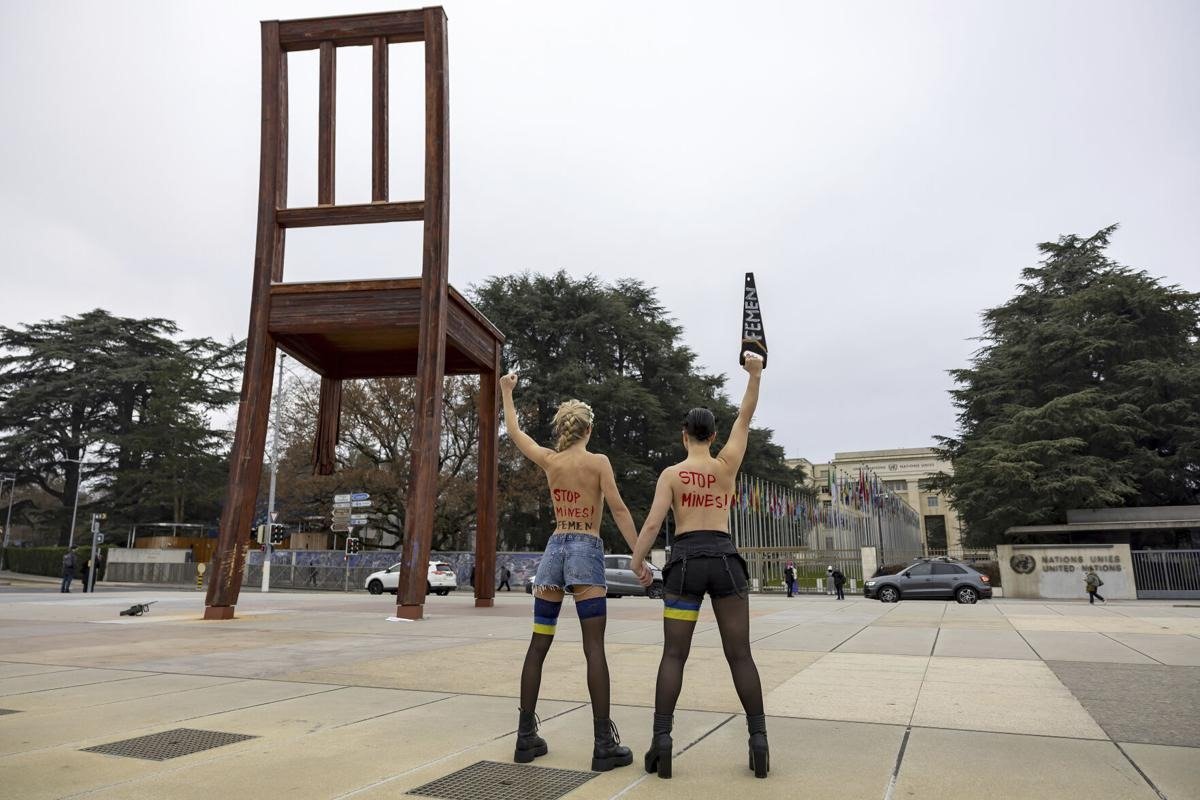 Ελβετία: Γυμνόστηθες φεμινίστριες προκάλεσαν ζημιές σε μνημείο έξω από το κτίριο του ΟΗΕ στη Γενεύη
