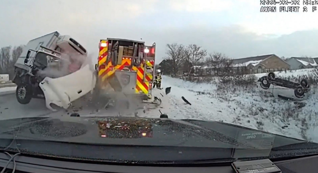 Dashcam footage shows a box truck crashing into emergency vehicles along I-94 Thursday morning. 🎥: Kalamazoo County Sheriff’s Office