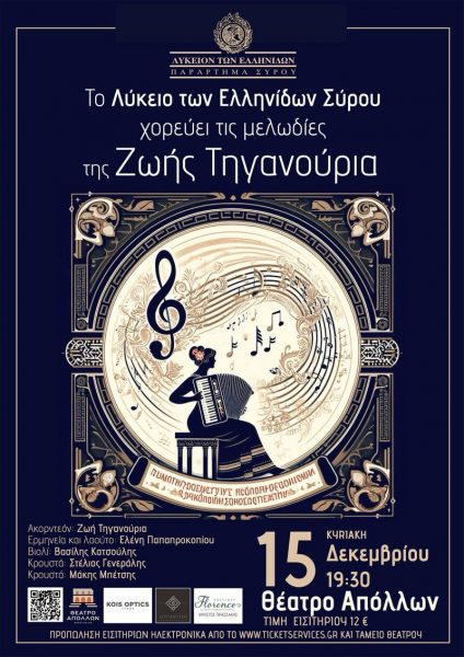 Μέσα από αυτή τη μοναδική βραδιά, η Ζωή Τηγανούρια και το Λύκειο τω Ελληνίδων Σύρου θα μας ταξιδέψουν σε μια διαχρονική και συναισθηματικά φορτισμένη γιορτή, που υπόσχεται να αγγίξει τις ψυχές των θεατών και να αφήσει ανεξίτηλα ίχνη στις καρδιές όλων των παρευρισκόμενων.