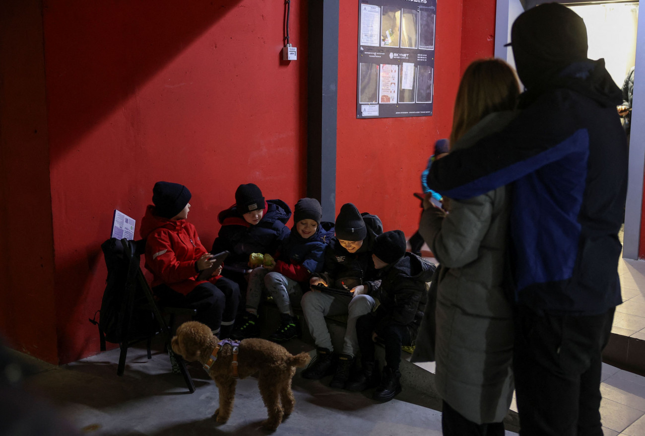 Παιδιά και οικογένειες βρίσκουν καταφύγιο σε υπόγειο πάρκινγκ την ώρα της ρωσικής επίθεσης. REUTERS/Roman Baluk