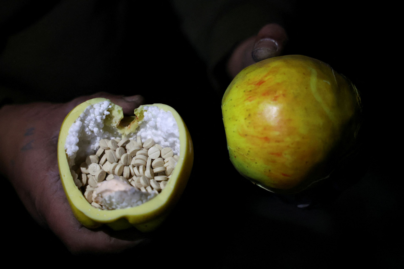 Ένα μήλο-καβάτζα που περιέχει χάπια Captagon στη Συρία. Τα εν λόγω χάπια ανήκουν στην οικογένεια των αμφεταμινών και η παγκόσμια παραγωγή έχει ως βάση τη Συρία από όπου προέρχεται το 80%.