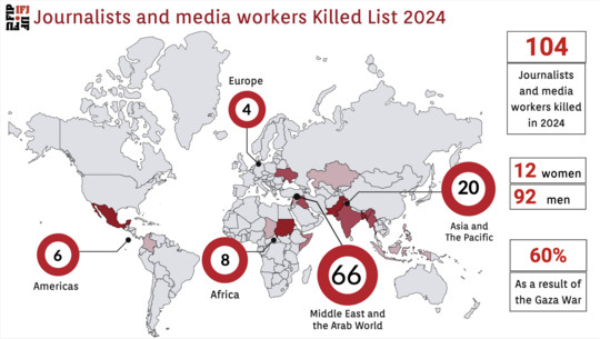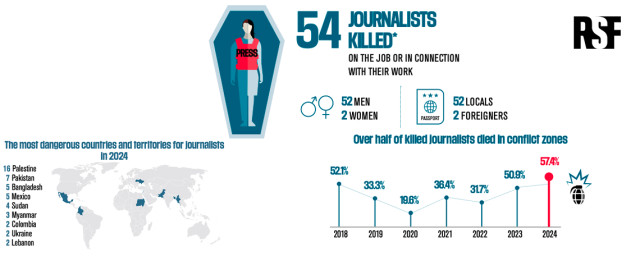 Τόσο οι RSF όσο και η Διεθνής Ομοσπονδία Δημοσιογράφων (ΔΟΔ) αποδίδουν στις ετήσιες εκθέσεις τους στον ισραηλινό στρατό, το το μεγαλύτερο ποσοστό των θανάτων δημοσιογράφων σε παγκόσμια κλίμακα το 2024.