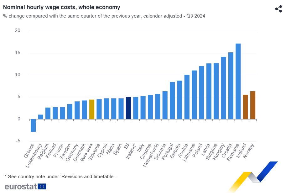 Συγκεκριμένα, το τρίτο τρίμηνο του 2024 σε σύγκριση με το ίδιο τρίμηνο του προηγούμενου έτους, οι υψηλότερες αυξήσεις του ωριαίου μισθολογικού κόστους για το σύνολο της οικονομίας καταγράφηκαν στην Ρουμανία (+17.1%), Κροατία (+15,1%), Ουγγαρία (+14,1%), Βουλγαρία (+12,7%) και Λετονία (+12,6%). Τρία ακόμη κράτη μέλη της ΕΕ κατέγραψαν αύξηση 10% ή περισσότερο, και συγκεκριμένα: Πολωνία (+12,0%), Λιθουανία (+11,0%) και Αυστρία (+10,0%), ενώ Ελλάδα κατέγραψε μείωση (-2,9%).