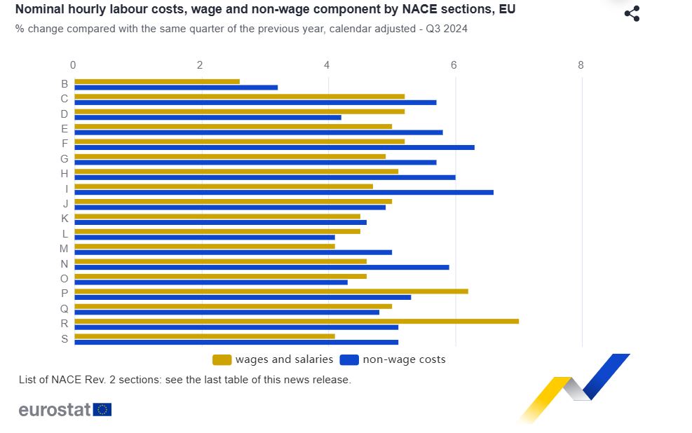 Το τρίτο τρίμηνο του 2024 σε σύγκριση με το ίδιο τρίμηνο του προηγούμενου έτους, το ωριαίο κόστος εργασίας στην ευρωζώνη αυξήθηκε κατά 4,6% τόσο στην (κυρίως) μη επιχειρηματική οικονομία όσο και στην επιχειρηματική οικονομία: